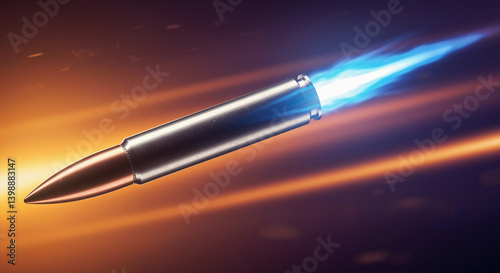 Silver bullet with blue flame soaring through a colorful background of orange and purple, showcasing dynamic motion and dramatic lighting