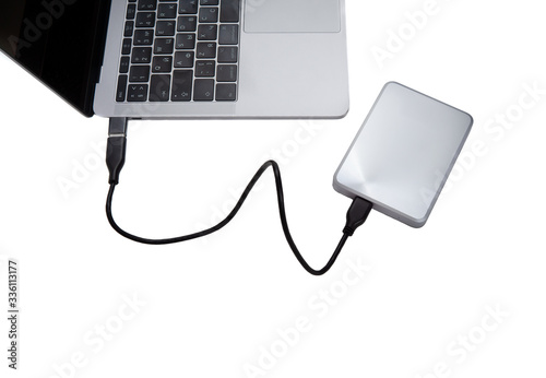 Silver external hard disk drive connected to a laptop computer for data backup. Top view, isolated on white
