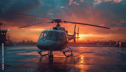 helicopter, helipad, sunset, aircraft, sky, cloud, city, city landscape, urban, transportation, aviation, flight, travel, evening, twilight, golden hour, aerial, rotor, blade, cockpit, landing, engine, tail, landing gear, take-off, aeroplane, aerodrome, airfield, tour tourism, business, transport, vehicle, machine, technology, engineering, pilot, crew, passenger, cargo, military