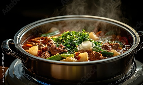 Silver hotpot filled with fresh vegetables and herbs on a stylish stove captures a cozy dining experience