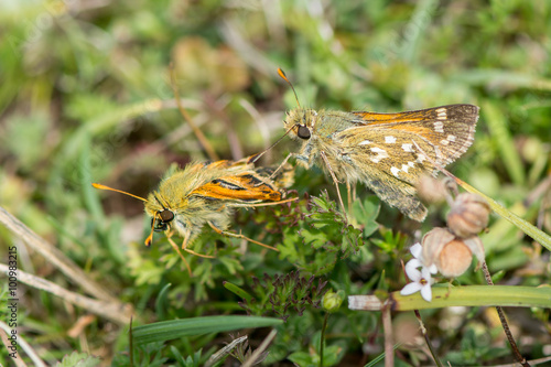 Silver-spotted skipper (Hesperia comma) pair territorial dispute. A malformed male in the family Hesperiidae is chased away from a territory at ground level