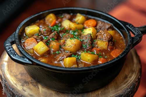 Simmering Stew in Cast Iron Dutch Oven on Rustic Cooking Stove
