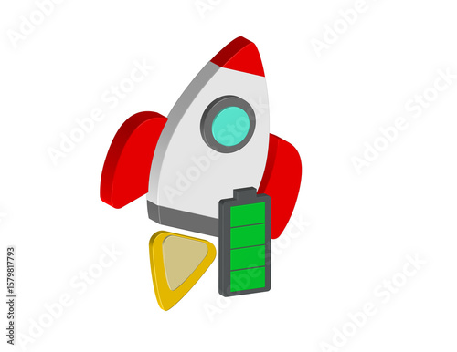 Simple 3D icon of a rocket icon with a charging battery, transparent background, png format