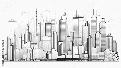 Simple black and white ink artwork of a modern big city. Buildings, skyscrapers, industry objects. Business heart of the country. Basic minimalist drawing on a white background.