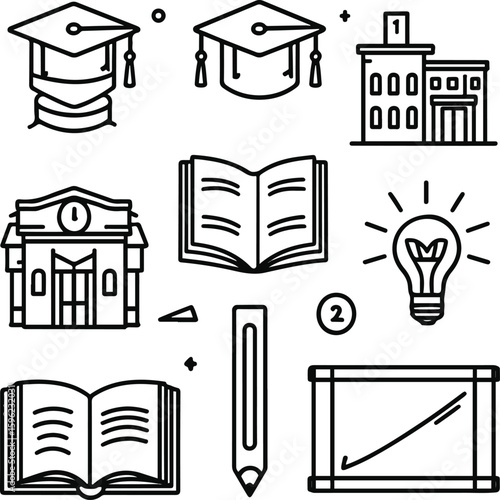 Simple black and white line icon set for education and learning. Include graduation cap, open book, pencil, ruler, school building, light bulb