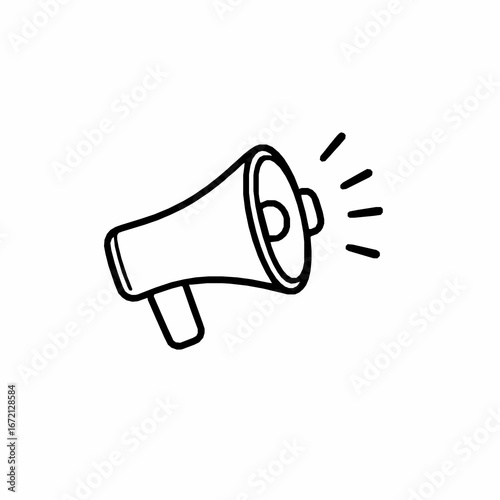 megaphone, bullhorn, announcement, sound, noise, communication, speaking, shouting, alert, attention, broadcast, simple, minimalist, drawing, vignetting, illustration, graphic, symbol, icon, isolated, white background, public address, voice, loud, message, information, declaration, audio, signal, line art, outline
