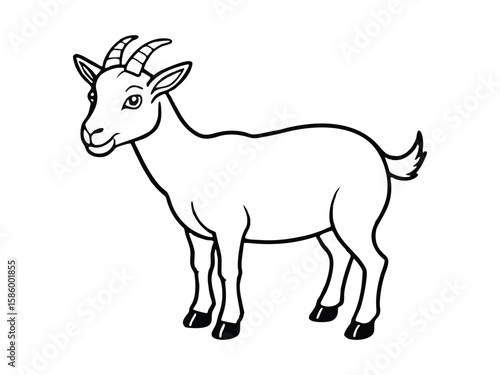 Simple cartoon line drawing of a happy goat standing and looking to the side isolated on white background