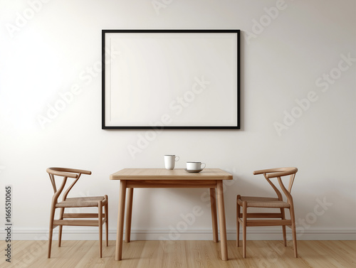 Simple dining setup with furniture and blank frame. Ideal for showcasing dining furniture and decor in a minimalist setting with an empty frame for custom designs or messages.