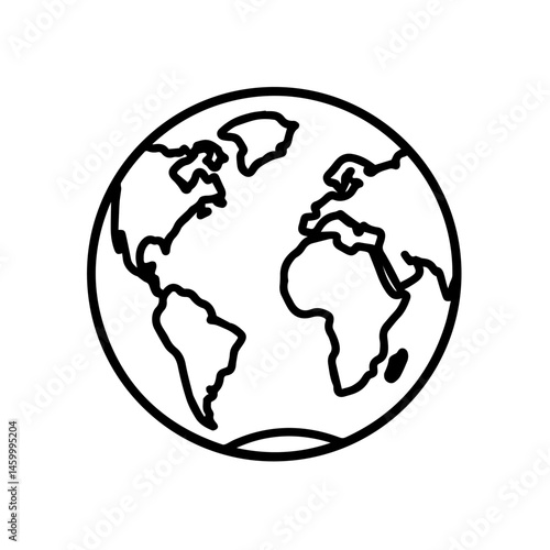 Simple earth globe line drawing. World map illustration shows continents and oceans. Clean earth icon perfect for educational materials, school projects, and geography lessons.