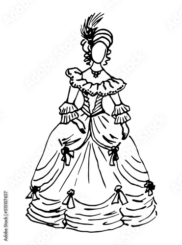 Simple hand drawn black outline vector drawing. Lady in vintage antique dress, hat with feather, crinoline puffy lace skirt. Historical fashion. Ink sketch.