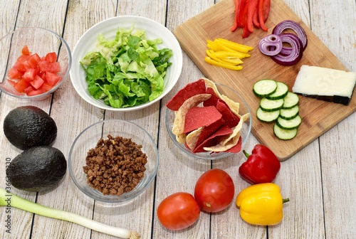 food, meal, taco, mexican, ethnic, tasty, ingredient, simple, tomatoes, preparing, prepared, ready, organic, healthy, diet, lifestyle, cooking, cook, meal, dinner, lunch, family, lettuce, whole, fresh, ready to eat, chef, eatery, homemade, bowl, background, closeup, wooden, kitchen, freshness, making, delicious, green, red, chips, nacho, chopped, diced, chopping board