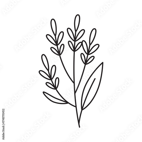 Simple Line Art Botanical Illustration Of A Delicate Plant Stem With Small Leaves And A Single Larger Leaf In Black Outline On A Transparent Background