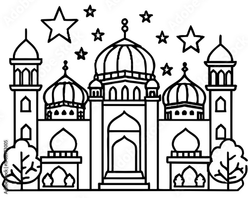Simple line art illustration of a mosque with domes and minarets surrounded by stars and trees