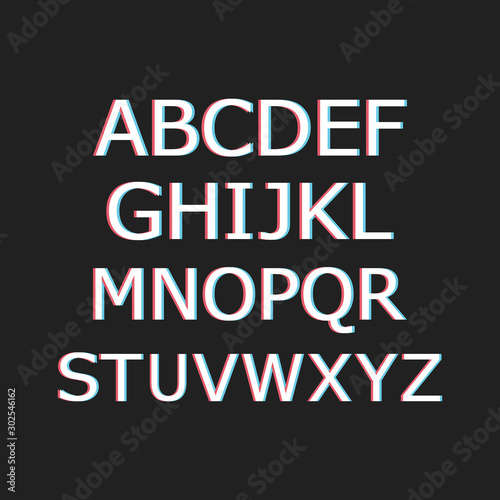 simple modern overprint alphabet, poster font typeface, glitch effect on black background.