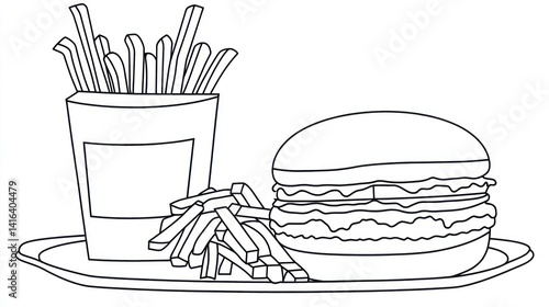 food, fast food, burger, fries, french fries, snack, lunch, dinner, meal, tasty, delicious, unhealthy, healthy, diet, calorie, junk food, eatery, take-away, disposable, paper, container, plate, tray, simple, outline, drawing, black-and-white, illustration, graphic, design, vector, art, vignetting, cartoon, colouring, printable, children