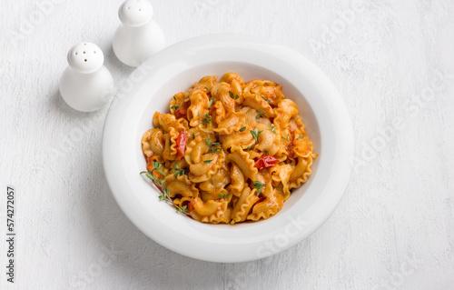 Simple pasta with tomato sauce sprinkled with fresh thyme in a white plate on a light gray background, top view, flat lay. Delicious homemade food