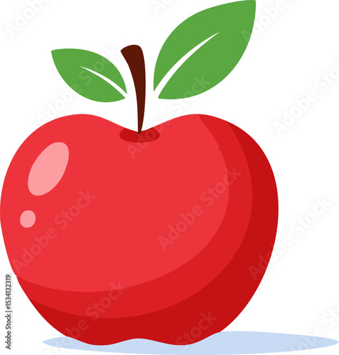 Simple red apple in flat style, clean white backdrop, vivid green leaves, subtle shading and soft light