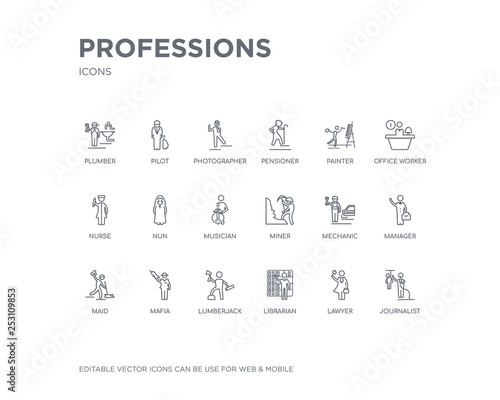 profession, office worker, icon, line, nurse, nun, musician, miner, mechanic, vector, outline, manager, set, maid, mafia, lumberjack, librarian, lawyer, journalist, icon, law, library, book, wood, tree, logotype, spy, cleaning, service, management, project, car, auto, mineral, mineral, music, rock, church, signs, doctor, health, office, men at work, linear, stroke, thin, signs, symbol