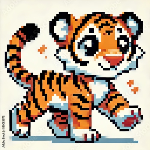 pixel, tiger, art, simple, digital, illustration, animal, design, isolated, white, background, cute, cartoon, character, graphic, vector, outline, small, minimal, minimalism, playful, symbol, icon, vignetting, bright, colours, eye-catching, high-coloured, clean, detailed, modern, retro, unique, compact, abstract, creative, vibrant, shape, bold, eye, tail, face, wild, realistic, pixelated, studio, game, animation
