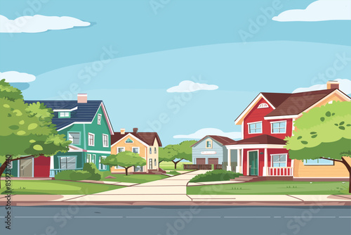 simple village house background illustration Flat style cartoon vector illustration. Suburban area flat color vector illustration. Countryside near city. Cute Houses background cartoon vector.