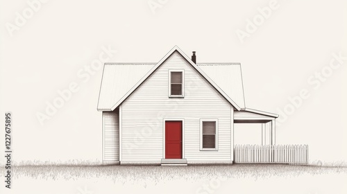 house, home, dwelling, residence, building, architecture, real estate, property, bungalow, cabin, shelter, roof, door, window, porch, fence, yard, grass, land, design, plan, vignetting, drawing, illustration, image, picture, graphic, art, simple, minimalist, white, red, small, rural, suburban, country, family, dream, peace, quiet, comfort, safety, security, homeownership, investment, lifestyle, living, space, style