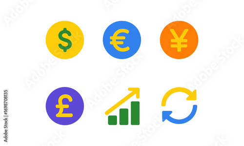 currency, exchange, icon, financial, design, money, dollar, euro, yen, pound, conversion, symbol, global, finance, trade, business, economy, market, banking, investment, transaction, rate, commerce, graphic, simple, minimalist, set, collection, signs, style, colourful, international, trend, growth, chart, arrow, update, cycle, round, circle, concept, digital, infographic, universal