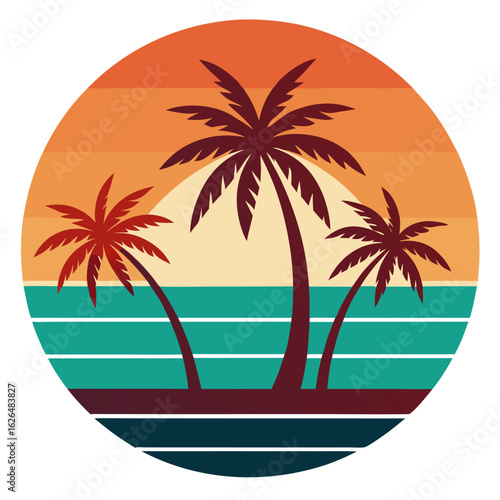 Simplified Round Sunset Vector with Balanced Palms and Ocean Waves in Retro Color Blocking