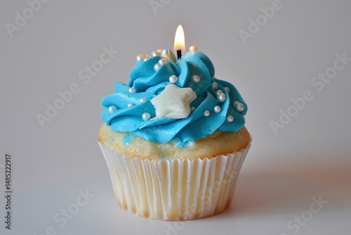 Single Blue and White Birthday Cupcake with Lit Candle Varient 4