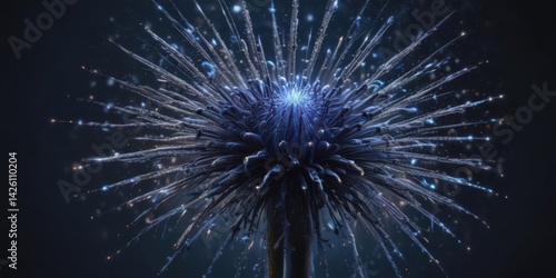 Single blue firework bloom, intricate detail, atmospheric depth, texture, star