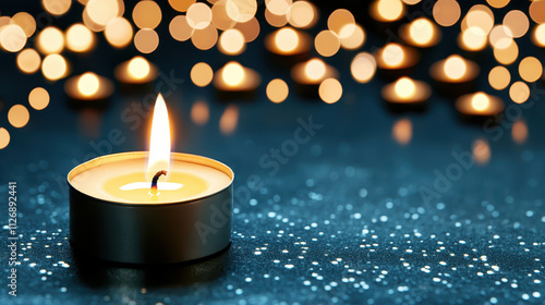 single candle burning brightly in dark room, creating warm ambiance