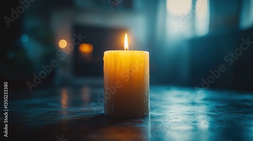 Single candle glowing on table in dimly lit room with fireplace and window light