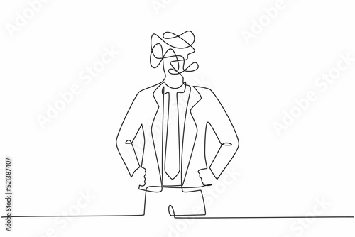 Single continuous line drawing businessman with round scribbles instead of a head. Male executive manager in formal suit standing and holding hand on hip. One line graphic design vector illustration