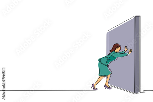 Single continuous line drawing businesswoman pushing wall. Successful career and brainstorm, career growth and problem solution, smart idea, professional development concept. One line design vector