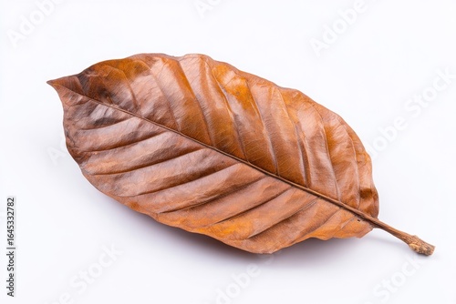 leaf, brown, dried, autumn, fallen, nature, plant, botany, organic, isolated, texture, vein, ribbed, surface, detailed, macro, closeup, single, horizontal, flat, pale, white, background, object, image, photo, natural, brownish, ridged, oval, elongated, stem, tip, foliage, dead, fall, shape, detail