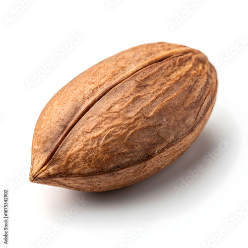 Single dried pili nut isolated on white background, highlighting its teardrop shape, smooth surface,