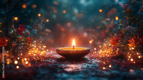 Single lit diya oil lamp surrounded by glowing flowers and bokeh lights candle flame