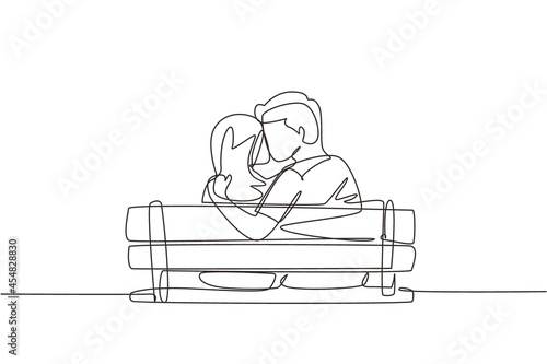 Single one line drawing couple sweet kissing sitting on bench in park romantic scenery. Happiness guy and girl relationship in love. Modern continuous line draw design graphic vector illustration