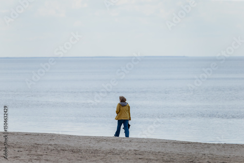 Single person walking by the sea to clear mind and relax, calming mind with relaxing stroll