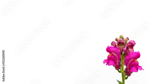 snapdragon, pink flower, bloom, blossom, floral, botanical, flower petals, green stem, fresh, beautiful, vibrant, bright, isolated, white background, studio shot, closeup, macro, summer flowers, garden flower, nature, ornamental plant, perennial, annual, natural beauty, organic, growth, photo, plant, single flower, lush, textured, symbolic, minimalist, simple, high key, copy space, cut-out, full bloom