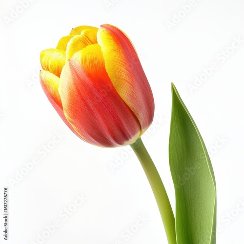 tulip, flower, red, yellow, orange, bloom, botanical, flora, plant, nature, spring, floral, garden, single, isolated, white, background, studio, shot, cut, fresh, vibrant, delicate, beauty, graceful, leaf, stem, detail, close