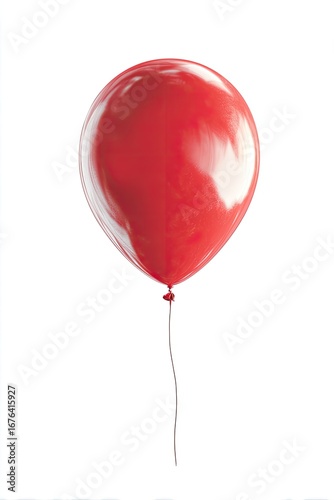 Single red balloon, glossy surface, light-colored string, isolated on white background