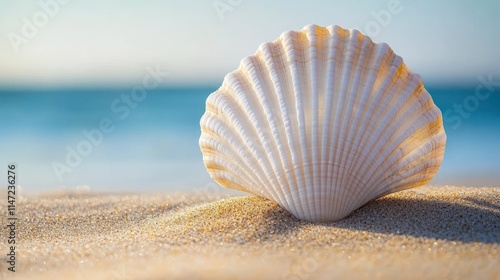 ocean, beach, sand, seashell, shell, scallop, summer, coast, sea, shore, water, sun, sky, horizon, nature, travel, vacation, holiday, tropical, paradise, relax, calm, peace, serenity, beauty, texture, wave, light, gold, white, blue, bright, morning, afternoon, day, landscape, view, scene, background, photo, image, picture, element, design