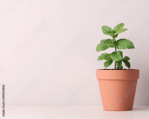 Single terracotta pot with mint plant, minimalist kitchen herb garden