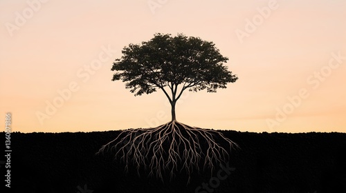 Single Tree with Deep Roots Against a Warm Colorful Sunset Sky