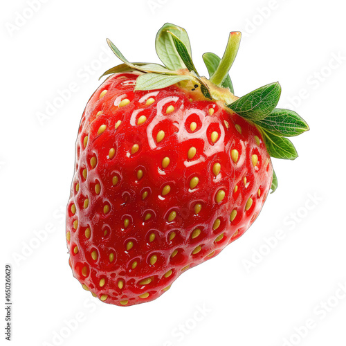 Single, vibrant red strawberry, close-up. Fresh, glossy skin with numerous small, golden seeds. Green leaves and stem attached. Isolated against black background