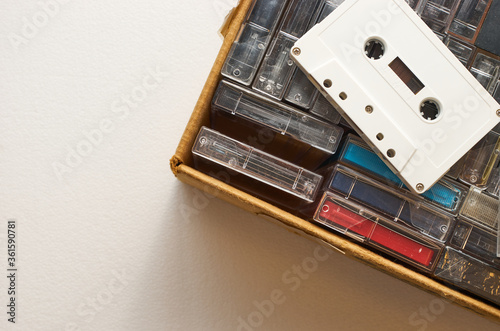 Single white audio cassette without markings on top of the box with many tapes. Close-up shot