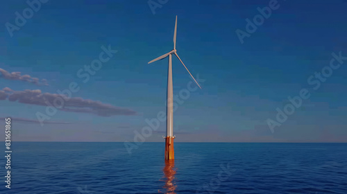 single Wind Turbine offshore in the Sea Under Clear Evening Sky with Reflective Water, sustainable Clean Renewable energy, striving for net zero