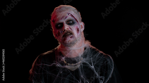 halloween, zombie, monster, undead, man, police, nailing, psychopath, dead, scar, scarey, make-up, wounded, costume, creepy, horror, nightmare, fear, studio, black background, daemon, spider's web, contact lens, death, holiday, blood, vampire, surrender, devil, skittish, festival, crazy, provocative, panicked, angry, frightening, art, evening, hair, hand, actor, prosthetic, disease, guy, make-up, sinister, skull, deceased