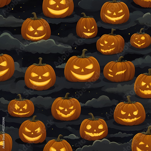 Sinister Pumpkin Patch Under Dark Sky with Carved Faces and Glowing Pumpkins