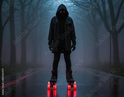 skater, mystery, eerie, horror, fog, hooded, neon, urban, red, glowing, forest, night, dark, road, skittish, thriller, mist, enigmatic, surreal, futuristic, strange, odd, creepy, chilling, ominous, foreboding, moody, atmosphere, silhouette, nightscape, roller, fear, tension, fright, shadow, light, isolation, loneliness, adventure, haunting, twilight